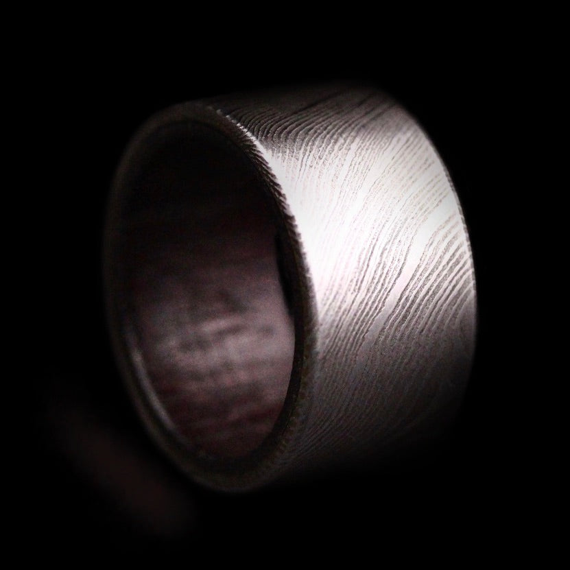 This ring is 12 mm wide and T 1/2 in size, lightly etched and highly polished. Damascus steel was worked and folded endlessly to create compact layers. Wood insert is created out of old victorian furniture. Purple hard wood itself is quite rare and sort out. It is naturally nearly black with purple tint. If you like this ring but the specifications are not right, contact us and we will make one just for you.