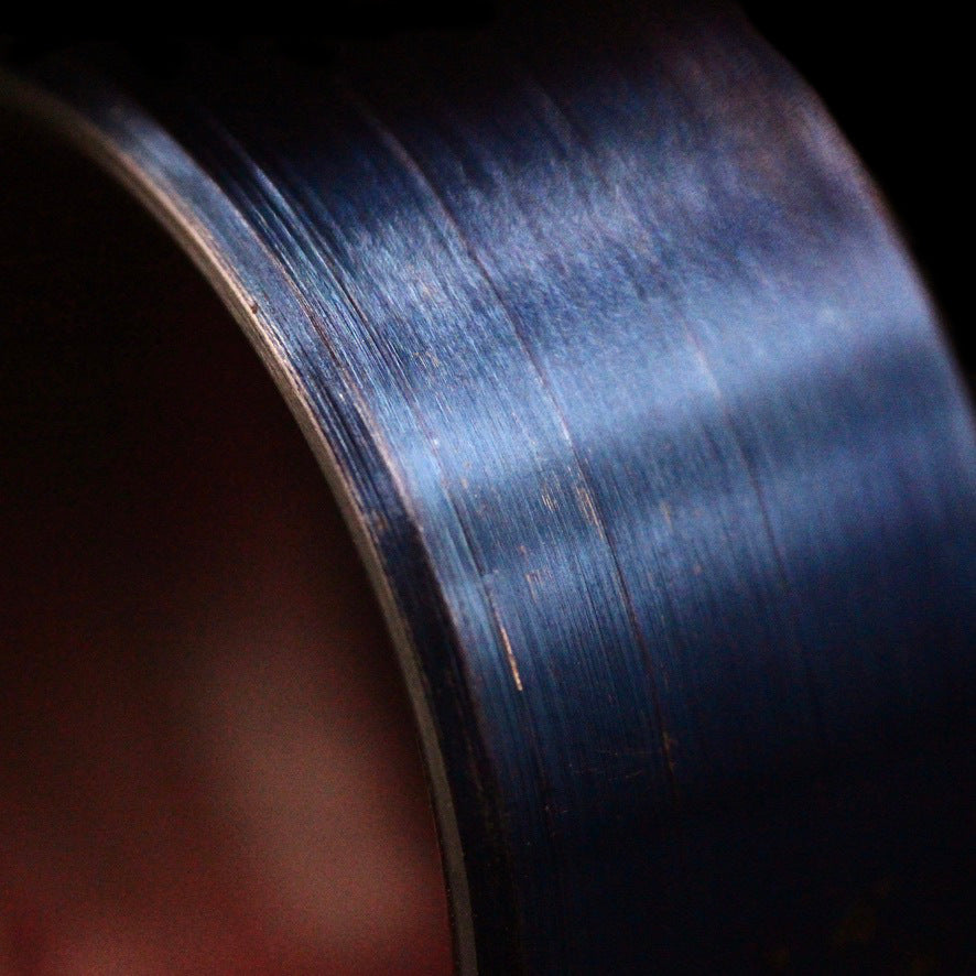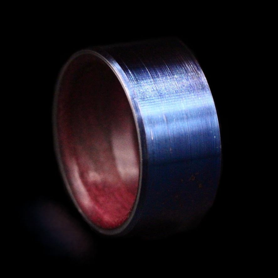 This ring is a one off, Z7 in size (25mm inside diameter) 15mm wide and 3mm thick. We have used a wing bearing from C-130J Hercules, the largest military airplane. Wing bearing itself is made out of titanium and afer treating it with heat we achieved beautiful colours, blues and purples. Wood insert come from Purpleheart. This wood when drys is changes colour from light grey, later to purple and with time to nearly black with purple tint. This is for a big hand.