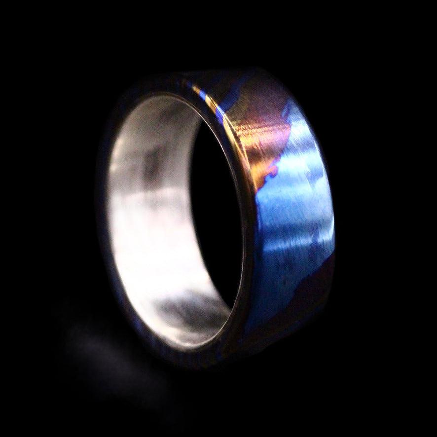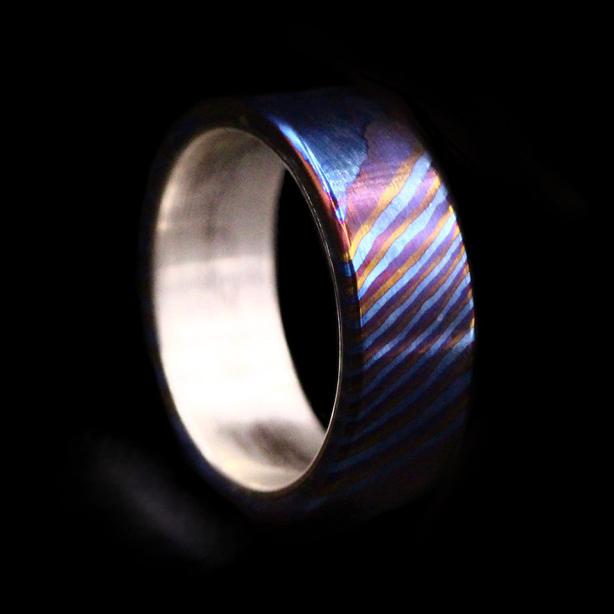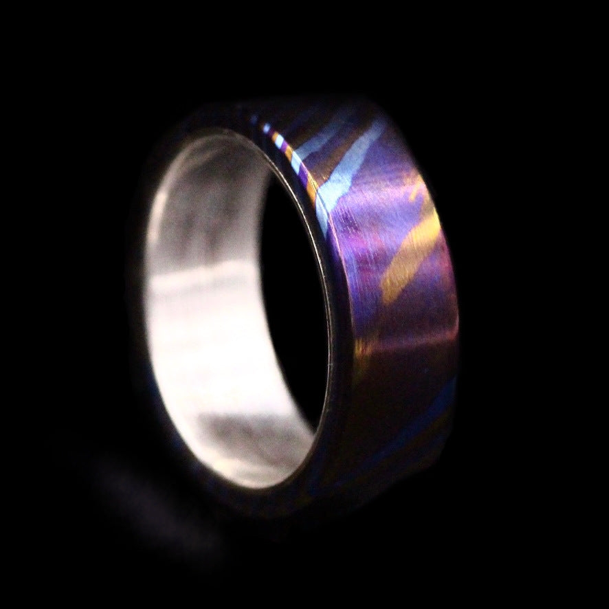 This Titanium Damascus ring consists of 3 titanium alloys laminated and patterned resembling steel Damascus. The various alloys colour differently through the use of heat. Each type of titanium alloy has the potential for a new colour combination. It is non-magnetic, corrosion resistant and lightweight.