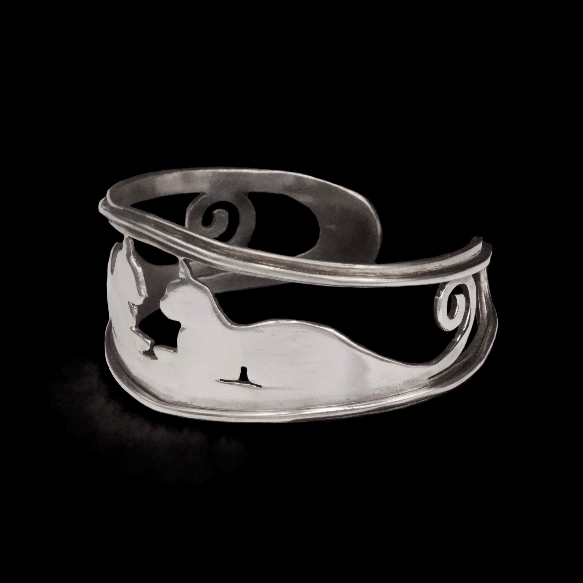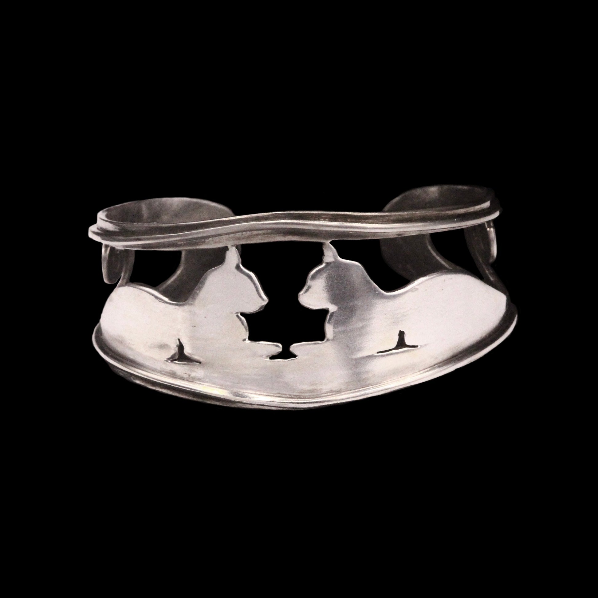 The sterling silver cuff bracelet features a unique design of two cats facing each other.