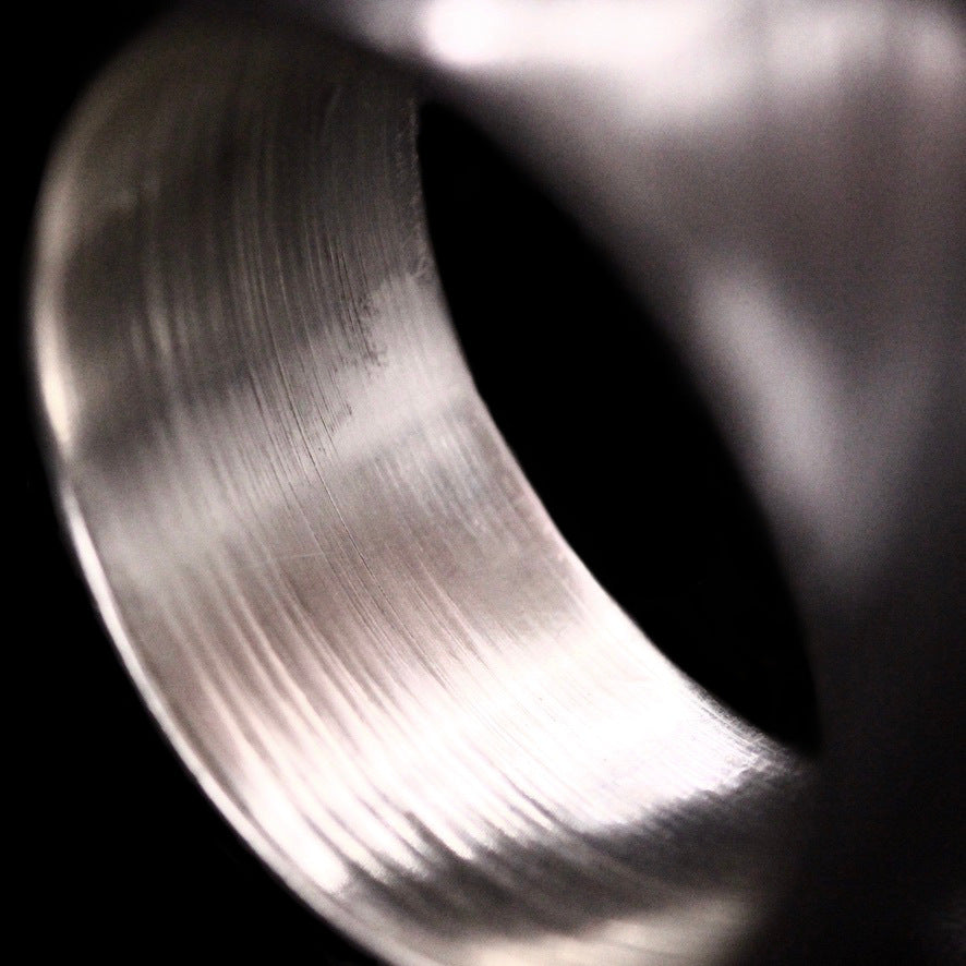 This ring is 11mm wide and Z in size, lightly etched ang highly polished. We use 100% recycled silver.