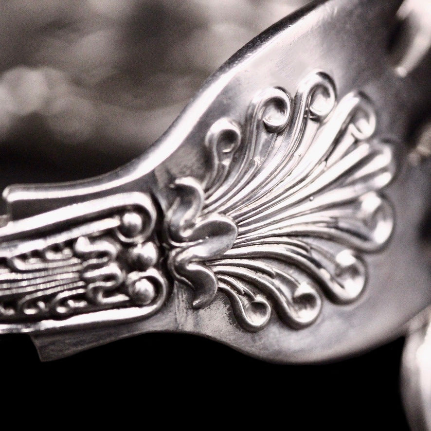 The Queens pattern was first introduced in 1820's and features scroll form and shell shaped accents to the handles. On the picture shown we have used fork from 1866. If you like the pattern but you would like different bangle design please contact us via email.