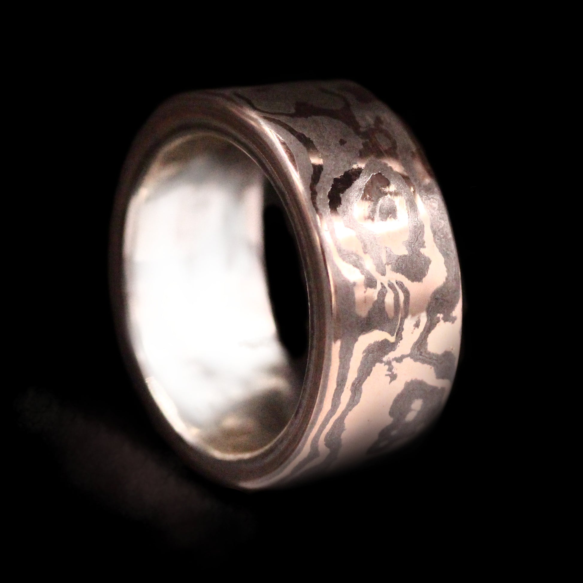 Mokume Gane is a laminated metal, made out of no iron metals fussed together in extremely high heat and pressure. Originally created around 300 year ago in Japan to decorate the hilt of the sword.