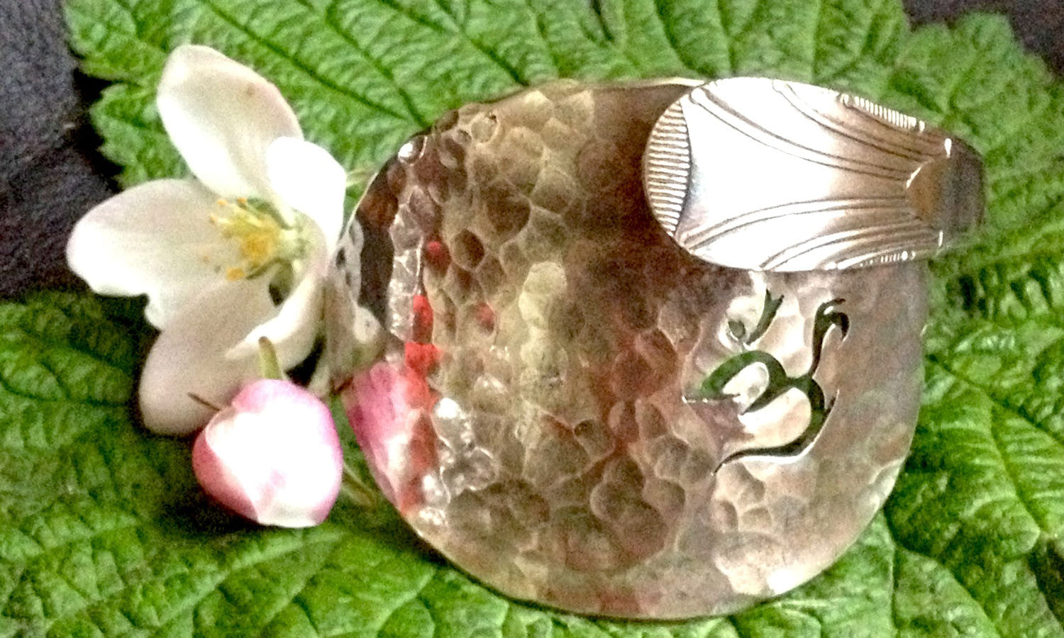 A simple beaten spoon bracelet with the Hindu symbol of the absolute cut out from it.