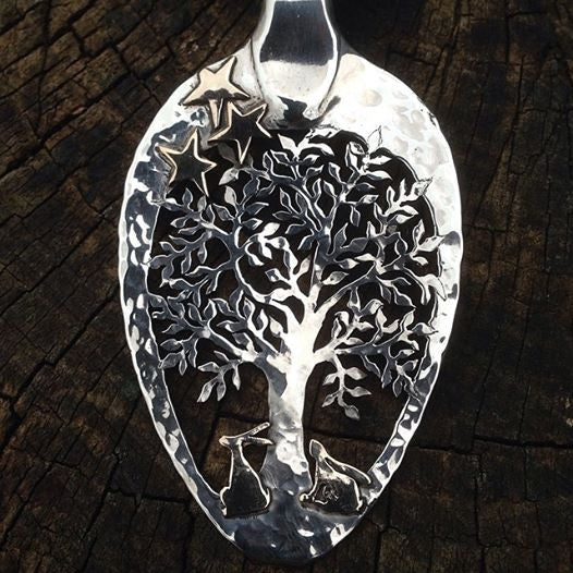 Here is our classic solid silver bespoke Starry Night Oak Tree Of Life design with 22 carat gold Rabbits and stars. You could also have cats, birds or squirrels and so on, all you need to do is let us know how you would like to personalise this spoon. This design looks fantastic on a standard-sized table or soup spoon, but really stands out when cut into a larger serving spoon.