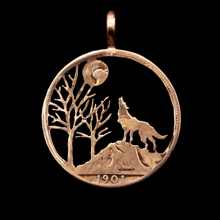 Winter Howl Cut Coin Pendant. The howl of a wolf evoked a sense of freedom and the untamed spirit of nature, representing a connection to the wild.