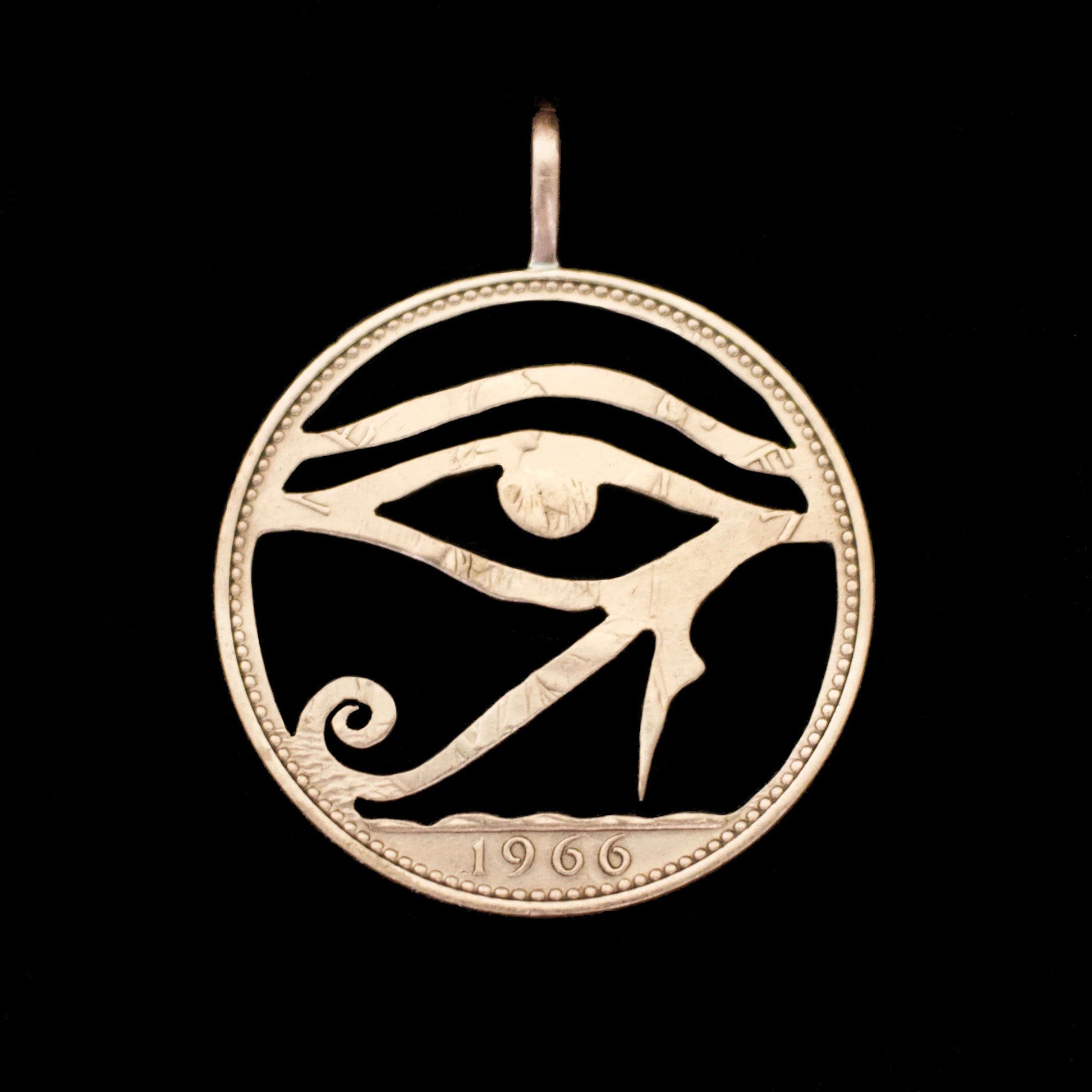 Eye of Ra Cut Coin Pendant represents ancient Egyptian symbol of protection, royal power and good health. The Eye of Ra is believed to provide safety and guidance.