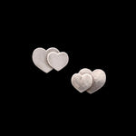 There sterling silver stud earrings are designed in the enchanting shape of two hearts creating a charming and romantic aesthetic.