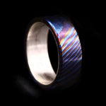 This Titanium Damascus ring consists of 3 titanium alloys laminated and patterned resembling steel Damascus. The various alloys colour differently through the use of heat. Each type of titanium alloy has the potential for a new colour combination. It is non-magnetic, corrosion resistant and lightweight.